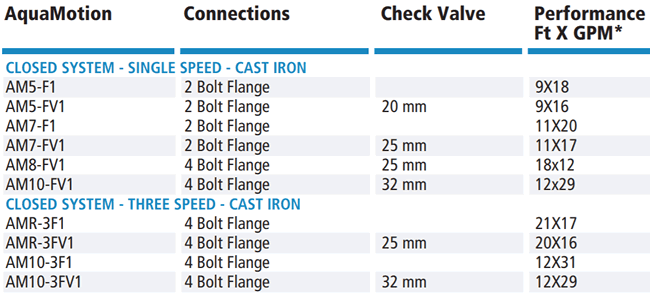 AquaMotion cast iron 3-speed circulators are rugged wet motor cartridge type circulators designed for closed loop hydronic heating systems, radiant heating, and indirect water heating applications. The wet motor design allows super quiet, single stage, in-line, and maintenance-free performance. 3-speed motors.