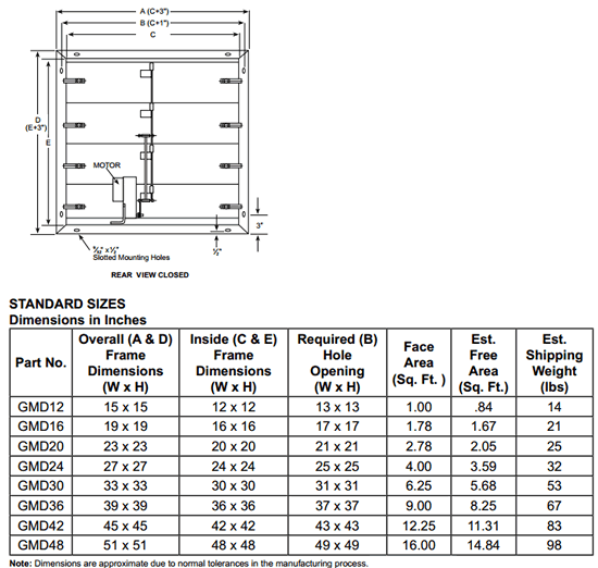 Models GMD are heavy duty motorized volume control dampers. The 1-1/2" flanged frame has welded corners for added strength. The 6" wide blades are center-pivoted for a full 90 deg rotation with parallel blade action. The dampers can be used for exhaust or supply applications and can be mounted in either a vertical or horizontal position; typically walls or curbs. Galvanized Steel (GMD) series comes standard with an internally mounted factory installed 120/240 volt power open / spring close motor with an end switch.